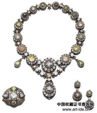 第二件为一套华丽首饰套装,其中宝石可能为俄国沙皇彼得大帝之后叶卡捷琳娜一世( 1684-1727 年) 赠予奥斯曼帝国苏丹艾哈迈德三世的礼物之一,为商讨 1711 年解除围攻普鲁特之需。依据传统,苏丹阿卜杜勒·哈米德二世( 1842-1918 年) 将这些珍罕宝石镶嵌于此条项链之上,后将项链赠予埃及赫迪夫陶菲克之妻,可能为庆祝其爱子、最后一位埃及与苏丹赫迪夫于 1874 年出生(拍品编号 328,估价 295 万至 492万瑞士法郎/300 万至 500 万美元)