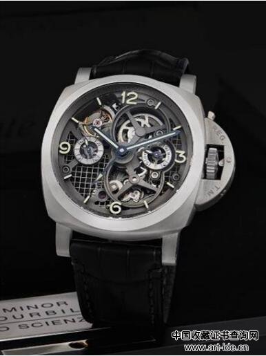 沛纳海,PAM00578 型号“ Lo Scienziato Luminor 1950 Tourbillon GMT”罕有特别版钛金属枕形镂空陀飞轮两地时间腕表备昼夜及/6 日动力储存显示,编号 014/150
