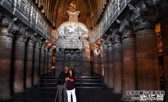 12月22日,两名游客在印度马哈拉施特拉邦的阿旃陀石窟内参观。 坐落于印度马哈拉施特拉邦奥兰加巴德市东北104公里处的阿旃陀石窟是印度古代佛教文化遗址,1983年被列为世界文化遗产。阿旃陀石窟凿于一座山的一处马蹄形暗色岩陡崖上,共有30个洞窟,其形成年代主要分为两个时期:公元前2世纪至公元前1世纪和公元5至6世纪。印度古代绘画在阿旃陀石窟保存得最多,水准也最高,因而这里被称为印度古代绘画的宝库。 新华社记者张迺杰摄