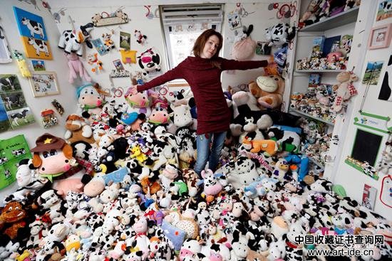 当地时间2017年3月12日,法国圣奥梅尔,法国模特Emeline Duhautoy与自己搜集的1679个奶牛造型毛绒玩具在一起。(图文来源:视觉中国)