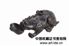 如图所示是一件明早期青铜瑞兽形砚滴,规格17×7.5×6.5厘米。此砚滴圆雕一只匍匐的瑞兽;瑞兽背部开有注水孔,并配有圆柱型小水柱;身体中空,内部盛水,嘴部为流,齿露,口衔耳杯;瑞兽两耳机警地伸向脑后,用力支撑起后腿,正欲迈步,满身雕刻纷披的鬃毛和飞翼,形象生动,颇为传神;瑞兽腿足强健有力,肢体浑圆,造型饱满。因年代久远,该器局部生出铜绿,色泽深沉,坚硬光亮。