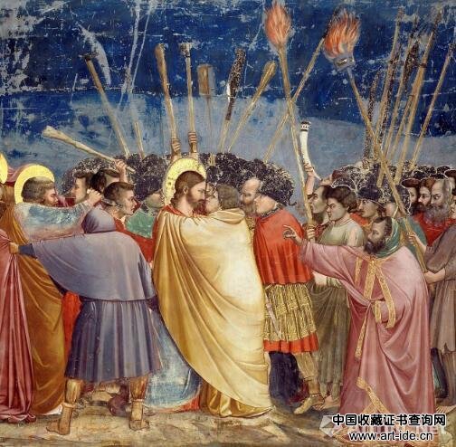 文艺复兴时期的艺术家通常把加略人犹大画成黄色,比如这幅乔托(Giotto,意大利画家,被誉为“欧洲绘画之父”)画在意大利帕多瓦一座小教堂墙上的壁画 (绘于1304-1306年)。